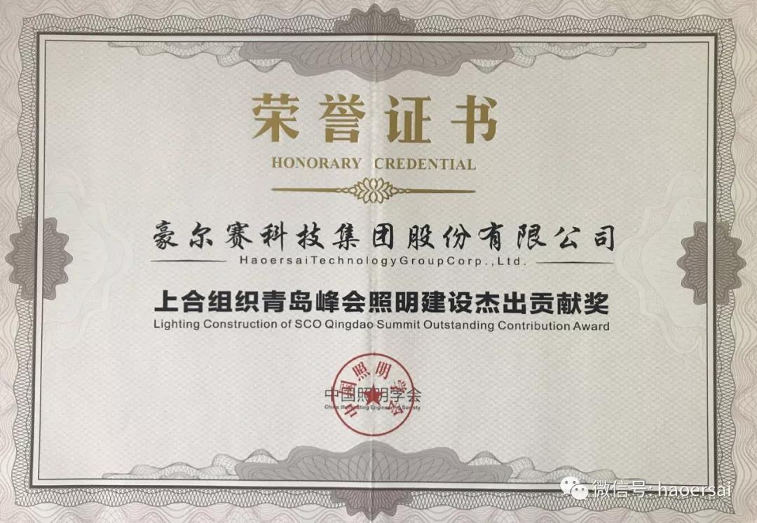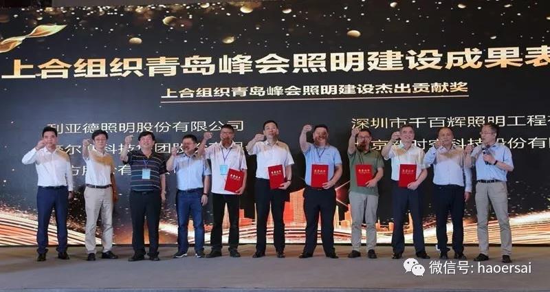 “上合组织青岛峰会照明建设成果高峰论坛暨照明建设成果表彰会”于2018年7月10日在青岛隆重举行,上合组织青岛峰会夜景建设过程中时间紧、任务重、要求高,各参建单位齐心协力、克服困难共同完成了此次盛举;在本次建设成果表彰会上,豪尔赛集团荣膺参建单位的奖项“杰出贡献奖”。